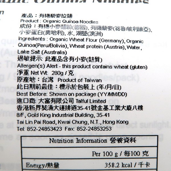 ● Ingredients: Organic wheat flour (Germany), organic quinoa (Peru/Bolivia), wheat protein (Austria), water, lake salt (Australia)