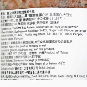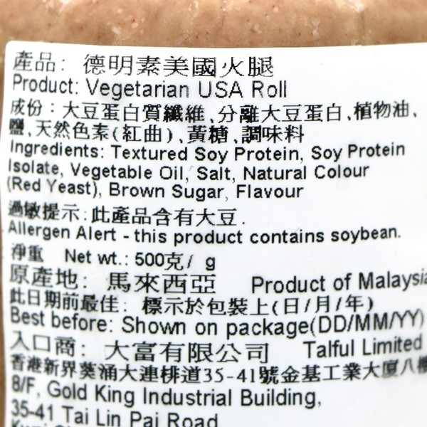Ingredients: Textured Soy Protein, Isolated Soy Protein, Vegetable Oil, Salt, Natural Monascus Anka Red Coloring, Brown Sugar and Spices